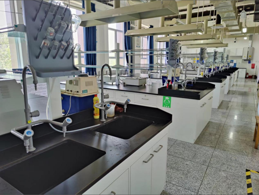 无机化学实验室建立于1986年,承担本学院及外院的无机化学基础实验。帮助训练和强化学生的基础实践操作技能,加深对无机化学等相关理论知识的理解,为今后的专业课程学习实践奠定基础。目前拥有实验室两间,实验预备室一间,实验试剂室一间,总占地面积567.82平方米。实验室有各类仪器104台/套,总价值54.62万元。无机化学实验室目前配有教师10名,实验技术人员3名。实验室开设实验主要涵盖无机化学、无机化学A/B、工程化学、大学化学、普通化学、无机及分析化学等课程,涉及化学、化工、能源、高分子、材料、食品工程、生物工程、生命科学、过程装备控制、材料、机械工程、能源动力工程、地质工程、土木工程、资源、未来科技等16个专业,每学年上课班级多达40个以上。课程主要教学内容包括实验室安全、实验原理、常数测定、无机物提纯、制备、合成及元素性质实验等,具体实验项目有仪器的认领和洗涤,实验室安全知识介绍、溶液的配制、氯化铵生成焓的测定、硫酸铜结晶水的测定、胆矾精制五水硫酸铜、醋酸电离常数的测定、配合物的生成和性质、碘酸铜溶度积测定、三草酸合铁酸钾的制备、三氯化六氨合钴的合成、卤素、氧、过氧化氢、硫、氮、磷、碳、硅、硼、碱金属及碱土金属、铍和铝、锡和铅、锑和铋、ds区元素化合物的性质、d区元素化合物的性质(Ⅰ)、d区元素化合物的性质(Ⅱ)、离子鉴定与检出、弱酸电离常数的测定、氯化钠提纯、氧化还原反应、二氧化碳分子量的测定、水溶液中的解离平衡、碱式碳酸铜的制备、置换法测定摩尔气体常数R、硫酸亚铁铵的制备等35个实验。